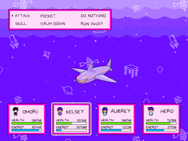 - ↑ 23.0 23.1 23.2 The damage calculation for KEL's pass to HERO has an oversight in the RPG MAKER MV project, it uses AUBREY's attack stats again instead of HERO's.