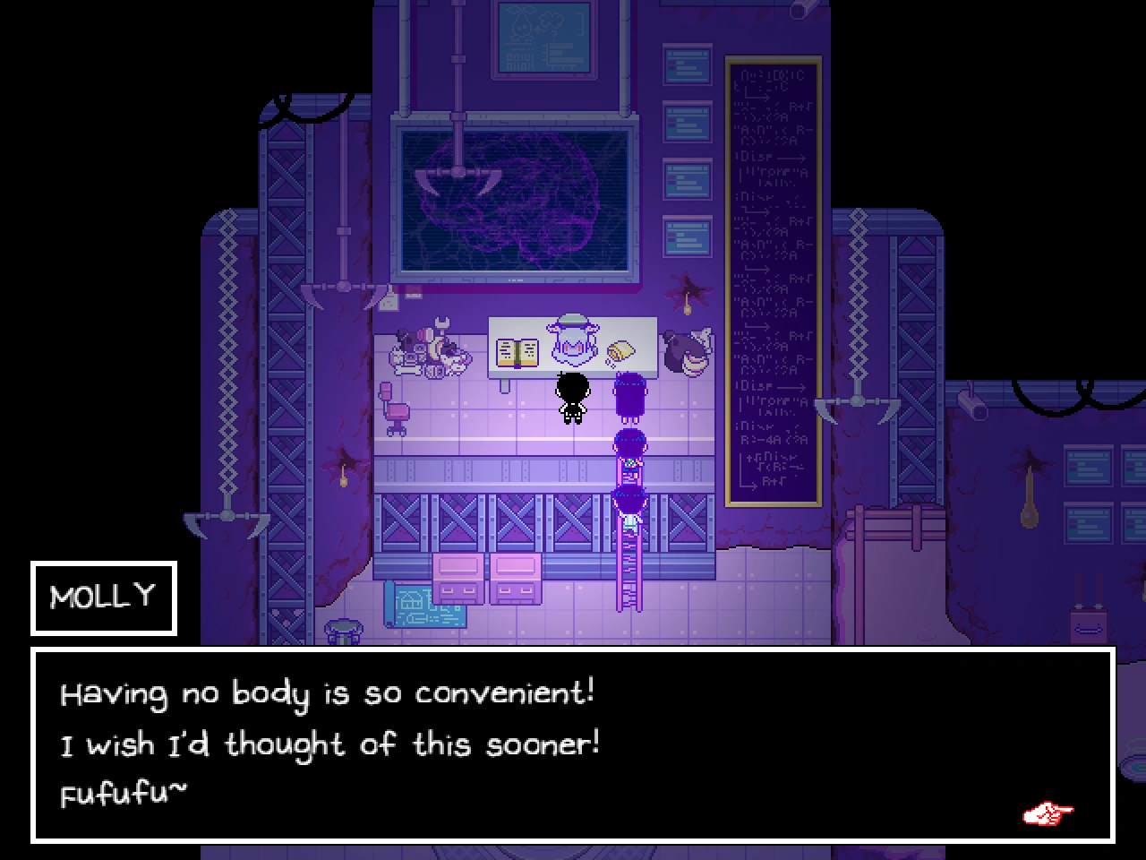 MOLLY can found within her lab but appears as an disembodied head like her other two sisters. Upon noticing OMORI and the party, MOLLY apologizes for her previous actions, noting she and her sisters tend to get carried away with their love for science.