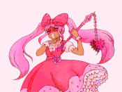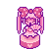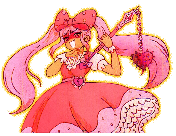 SWEETHEART is a young woman with tan skin and wears frilly feminine clothes (primarily in pink and red) and adorns herself with hearts, bows and polka dots. She has a large pink polka dot bowtie she wears on her head, and long wavy pink ponytails. In battle, she wields a pink flail with a heart-shaped striking head.