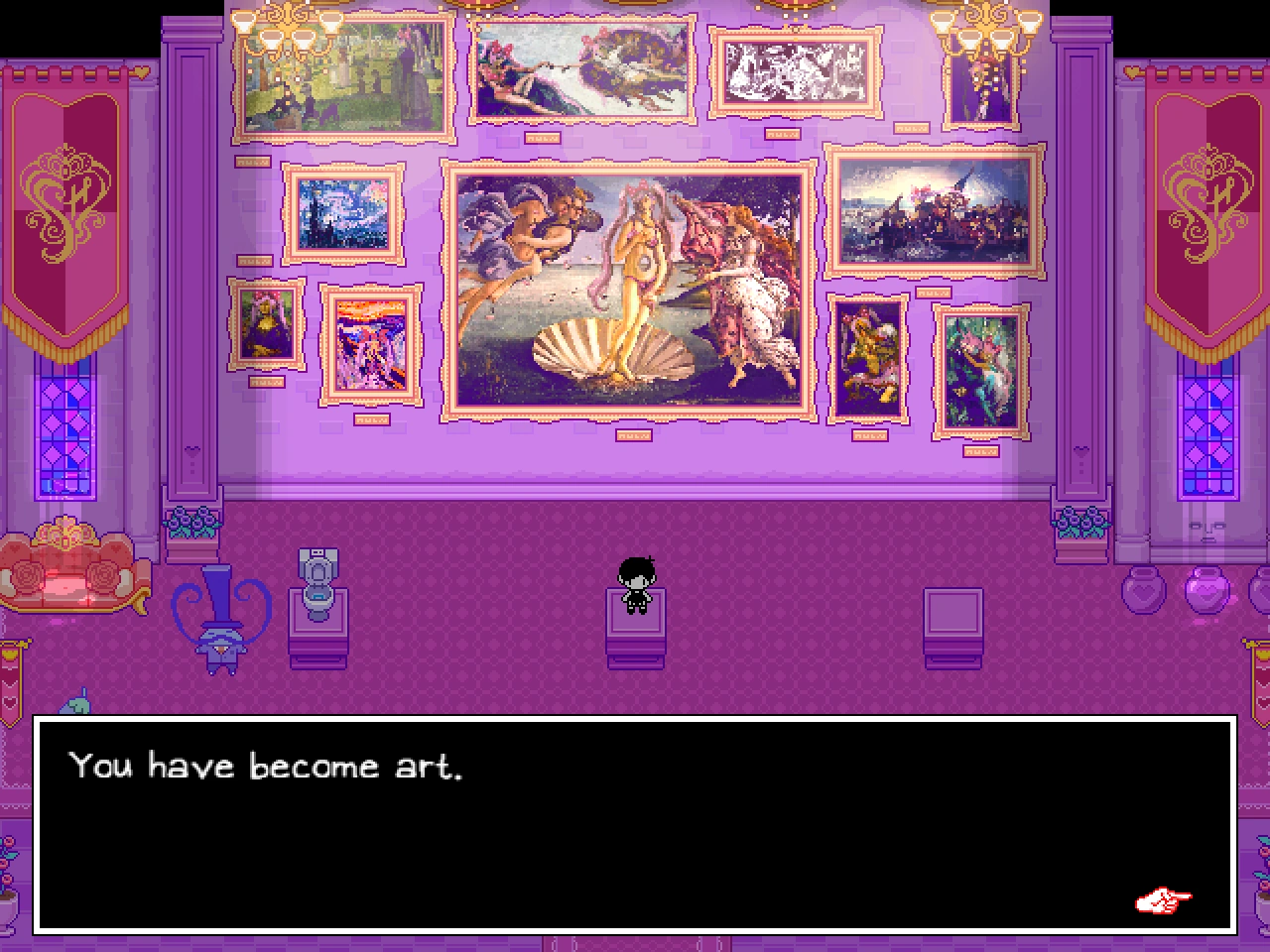 The most notable feature of THE ROYAL GALLERY are the eleven paintings of SWEETHEART, each one referencing a real life painting. Interacting with either side of the painting gallery will reveal the names of each painting. If the player interacts with the middle podium between the toilet and the HANGMAN key, something special will happen. This will lead to the "You have become art" event where the player character selected is shown standing on the podium while an audience cheers for them offscreen.